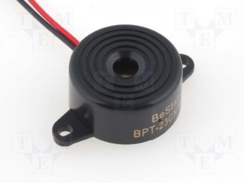 Hersteller BESTAR Schallwandler-Typ piezoelektrischer Signalgeber Eigenschaften von Schallwandlern mit internem Generator Resonanzfrequenz 3kHz Betriebsstrom 8mA Betriebstemperatur -20...60°C Durchmesser 22.7mm Höhe 12.2mm Betriebsspannung 3...20V DC Raster Montageöffnungen 29.8mm Lautstärke 80dB (d=0.3 m) Ausgänge Leitungen Toleranz der Resonanzfrequenz ±500Hz