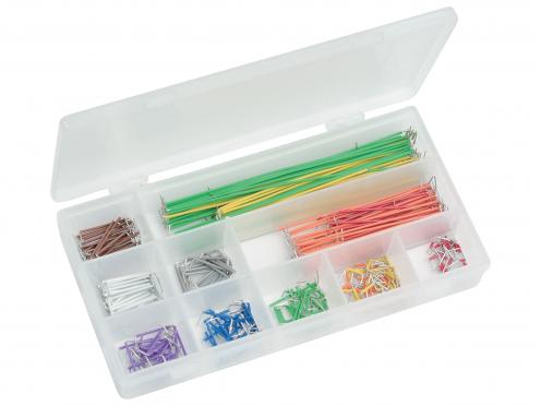 350 Stk. aus AWG22 Draht - 14 verschiedene Längen (je 25 Stk.) Vorgekürzt, abisoliert und gebogen Verschiedene Farben 14 verschiedene Längen (je 25 Stk.) Längen: 2, 5, 7, 10, 12, 15, 17, 20, 22, 25, 50, 75, 100 und 125 mm Karabinergröße: 270 x 130 x 30 mm