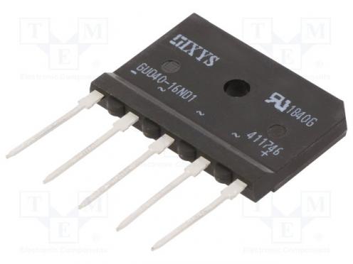 Halbleiter Element-Typ Dreiphasen Brückengleichrichter Struktur des Halbleiters Diode/Diode Rückspannung max. 1.6V Vorwärtsspannung max. 1.23V Vorwärtsstrom 40A Strom im max. Impuls 370A Gehäuse GUFP Elektrische Montage THT Ausführung flach Ausgänge Lötverbindung Verpackungs-Art Tube Hersteller IXYS