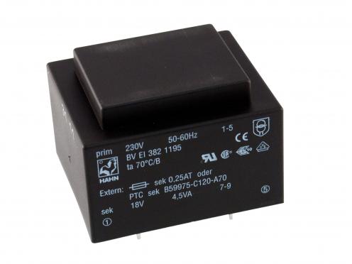 EI-Transformator für Leiterplatte EI 38/13,6, 1x18 V Leistung = 4,5 VA, U prim / sek = 230 V / 1x18 V, I = 250 mA,