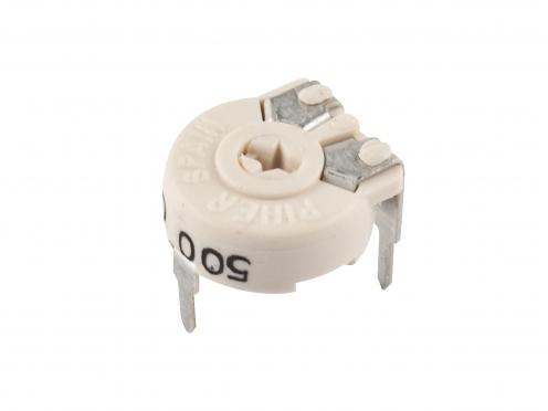 Cermet-Trimmer-Widerstand liegend 500R Ohm. Mechanische Ausführung: Abmessungen (Einbau) LxBxH = 10,3x10x6,5 mm, Schlitztyp = 2 (Nummerierung entspricht Abbildung auf der Website), Anschlussteilung RM = 5x10 mm.