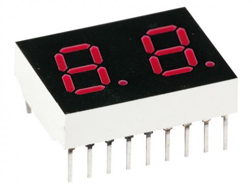LED-Display 10 mm, Farbe: Rot Anzahl Zeichen: 2 Gemeinsamer Anschluss: Anode Farbe: Rot Dezimalpunkt: Rechts Max. Strom pro Segment: 30 mA Durchlass-Spannungsabfall: 2-2,5 V Leuchtstärke: 1,2 mcd
