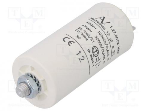 Hersteller KEMET Kondensator-Typ Polypropylen Kondensatorenanwendung für Motoren, Betrieb Fassungsvermögen 12µF Gehäuseabmessungen Ø35x73,5mm Betriebstemperatur -25...85°C Toleranz ±5% Klimakategoria 25/085/21 Lebensdauer 10000h Ausgänge Verbinder 6,3x0,8mm Befestigung Schraube M8 Kondensatorenserie C27 Betriebsspannung 420V AC