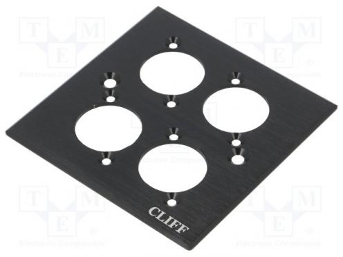 Hersteller CLIFF Steckverbinder Zubehör-Typ Montageadapter Steckverbinder-Variante mit Logo Steckverbinder-Variante vierfach Mechanische Montage Öffnung für Senkkopfschraube Farbe schwarz Gehäuse-Material Metall Gehäuse XLR-Standard Raster Montageöffnungen 19 x 24mm