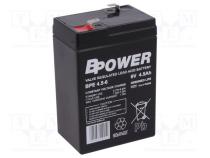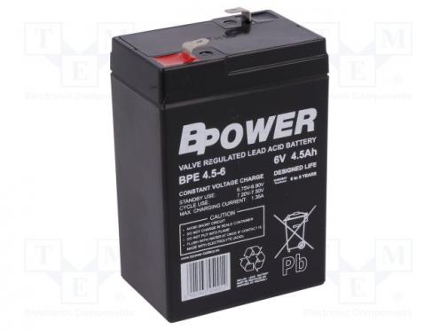 Hersteller BPOWER Akku-Typ Blei- Nennspannung 6V Fassungsvermögen 4.5Ah Technologie AGM Caractéristiques des batteries wartungsfrei Äußere Abmessungen 70x47x106mm Lebensdauer 6-9 Jahre Ausgänge Verbinder 4,8mm Gewicht 0.8kg Akkuanwendung Alarmanlagen Akkuanwendung Systeme zur Aufrechterhaltung der Versorgung Herstellerserie BPE