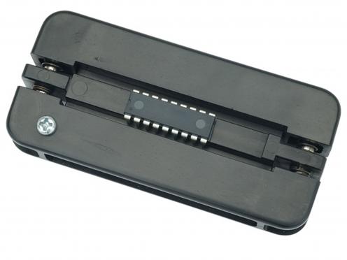 Einreihgerät für IOs in DIP-Gehäusen mit einem Pinreihenabstand von 7,62 mm und 15,24 mm. Antistatisches Plastik, Erdungsschraube. Schmalere Seite für Gehäuse DIP8 bis DIP20, breitere Seite für DIP24 bis DIP48.