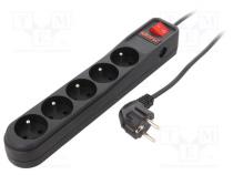 Hersteller ARMAC Steckdosenleisten-Typ Absichernd Buchsenanzahl 5 Betriebsstrom max. 10A Farbe schwarz Stromleitungslänge 1.5m Eigenschaften von Sicherheitssteckerleisten Absicherung mit einer Sicherung Eigenschaften von Sicherheitssteckerleisten beleuchteter 2-poliger Ausschalter Eigenschaften von Sicherheitssteckerleisten Netzstecker mit Schutzkontakt Eigenschaften von Sicherheitssteckerleisten Überspannungsschutz Äußere Abmessungen 290x50x45mm Max. Betriebsspannung 250V AC